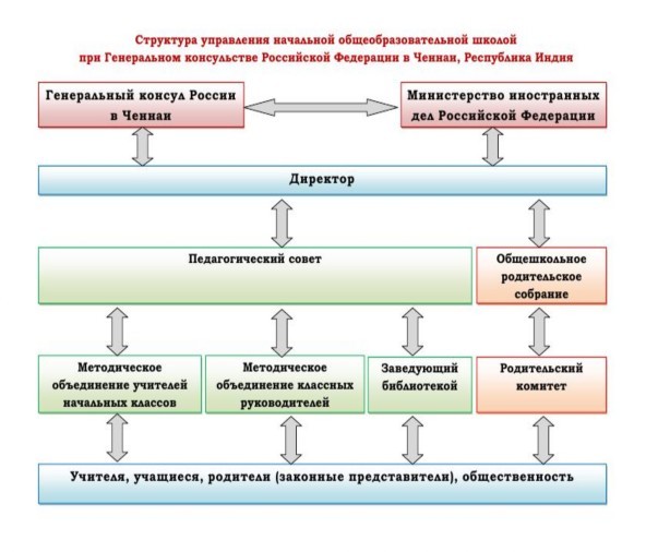 6.1. Управление общеобразовательной школой при Генеральном консульстве Российской Федерации в Ченнаи, Республика Индия, осуществляется на основе сочетания принципов единоначалия и коллегиальности. Общее руководство Школой осуществляет Генеральный консул Российской Федерации в Ченнаи, Республика Индия. Функции руководителя Школы выполняются ее директором, который подчинен и подотчетен Генеральному консулу, а также подотчетен Министерству иностранных дел Российской Федерации.